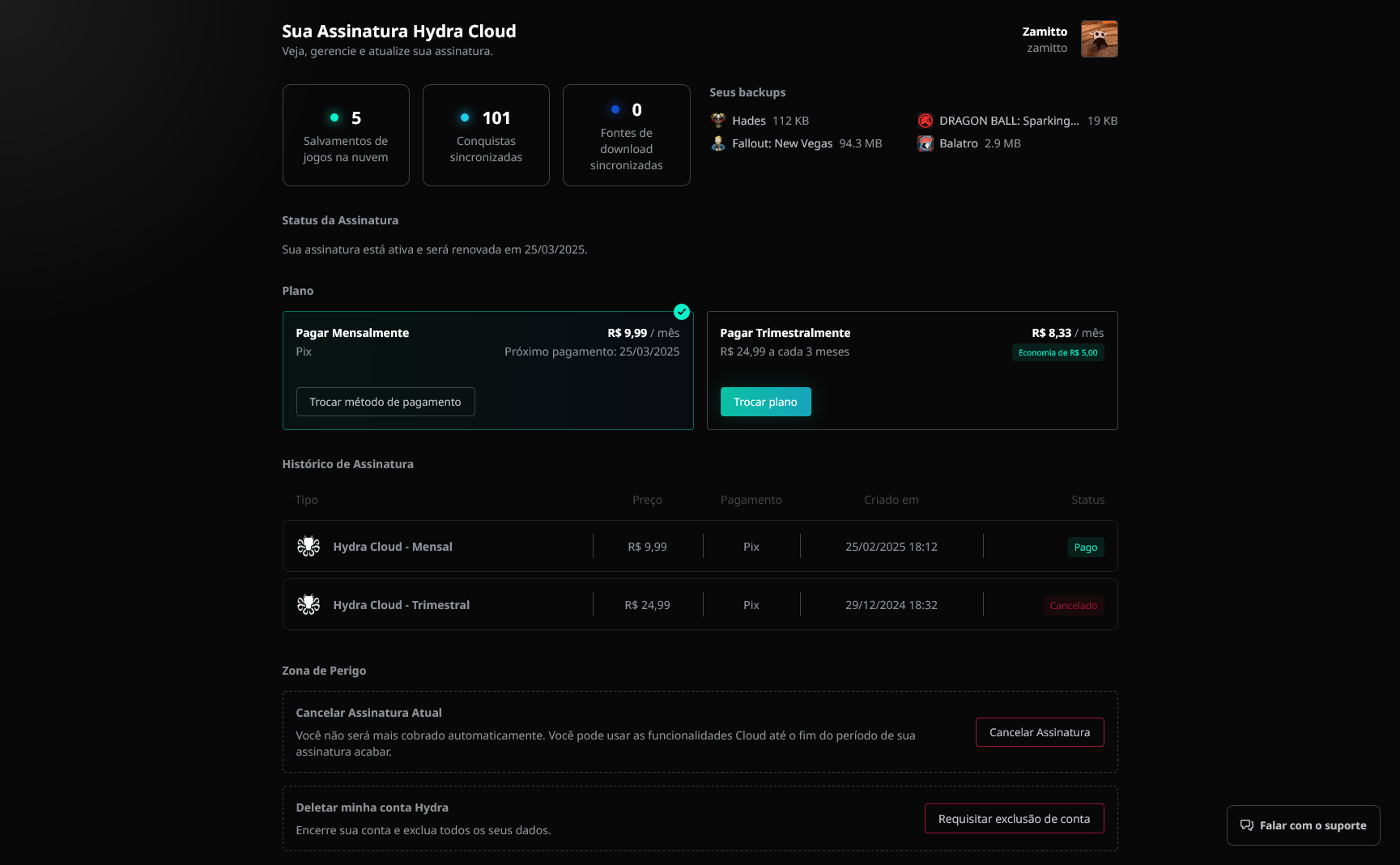 Nova tela de gerência de assinatura (checkout.hydralauncher.gg):