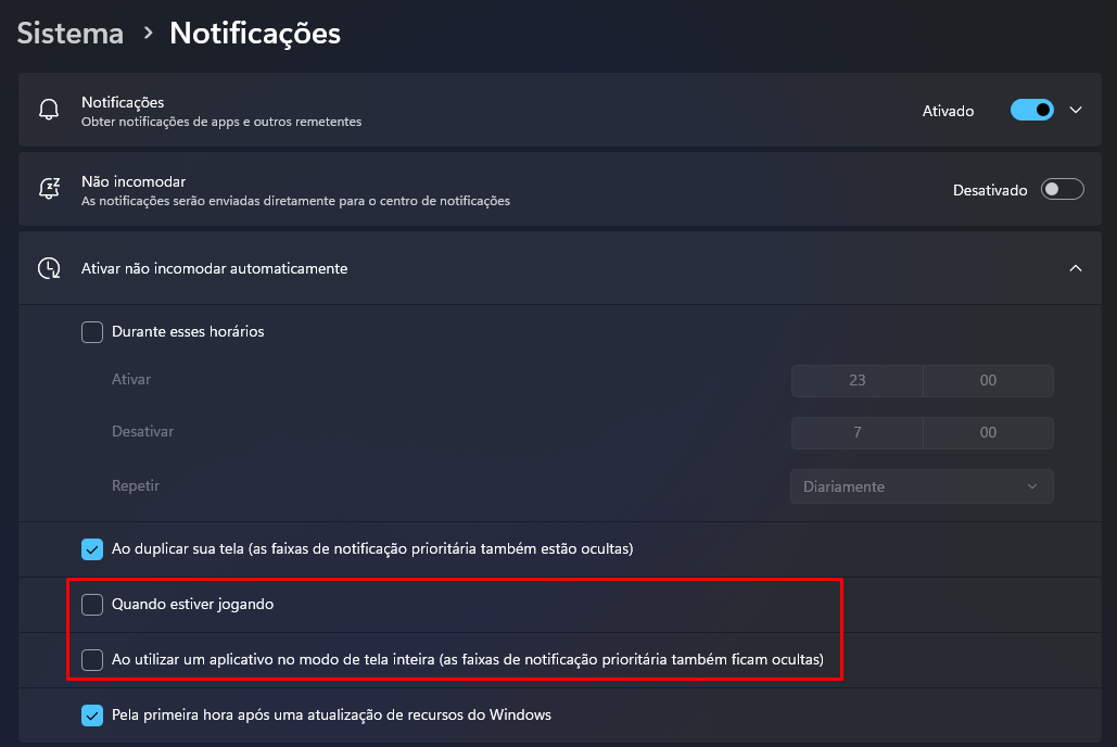 Agora, caso tenha essa opção desabilitada, o Hydra irá usar as notificações nativas do sistema operacional. Para que elas apareçam enquanto você esteja jogando algum jogo, você precisa acessar as configurações do Windows e desativar essas opções: