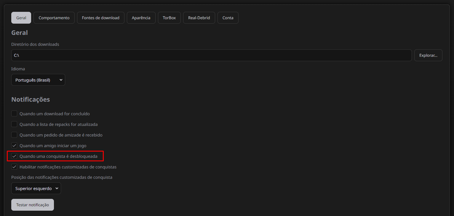 Na atualização 3.5, o Hydra reformulou a notificação das conquistas, e adicionou uma nova opção para elas, a opção “Habilitar notificações customizadas de conquistas”, que já vem habilitada por padrão. É possível clicar em “Testar notificação” para visualizar como ela irá aparecer na sua tela.